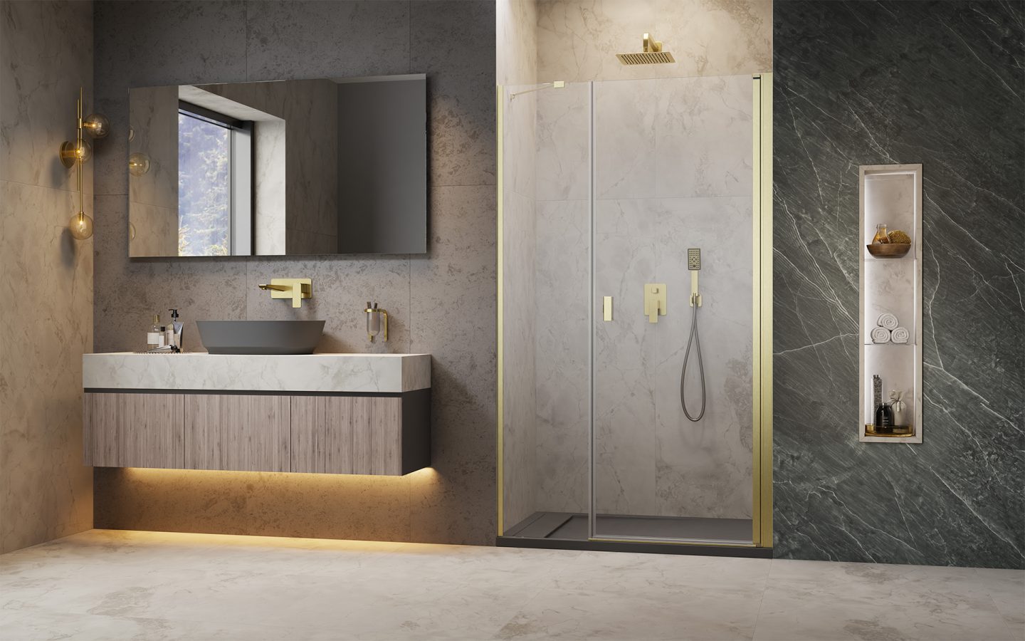 Откройте для себя серию душевых кабин Nes Brushed Gold с элегантными деталями в цвете брашированного золота, которые добавляют роскошный характер любой ванной комнате. Безупречная отделка, современный дизайн и долговечность.
