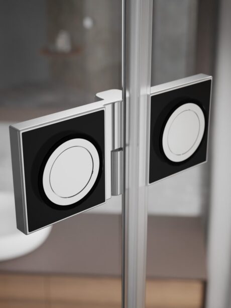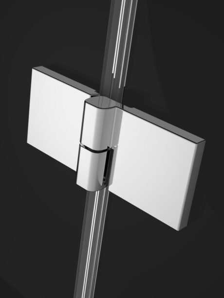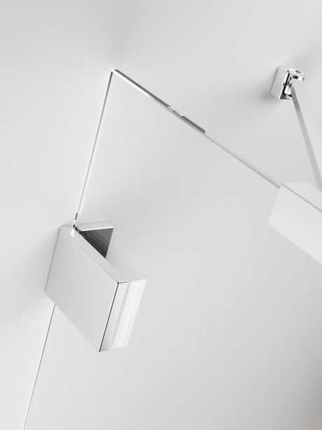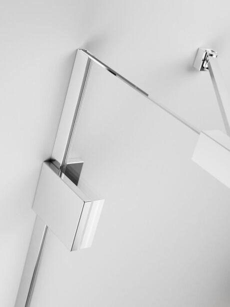 Essenza Pro — коллекция кабин разных форм, дверей и шторок, в которых стационанрое стекло закреплено к стене с помощью кронштейна, а не профиля. Допустимы два варианта монтажа: с уплотнительным профилем, или без него. Створка двери подвешена на латунных петлях и открывается только наружу.