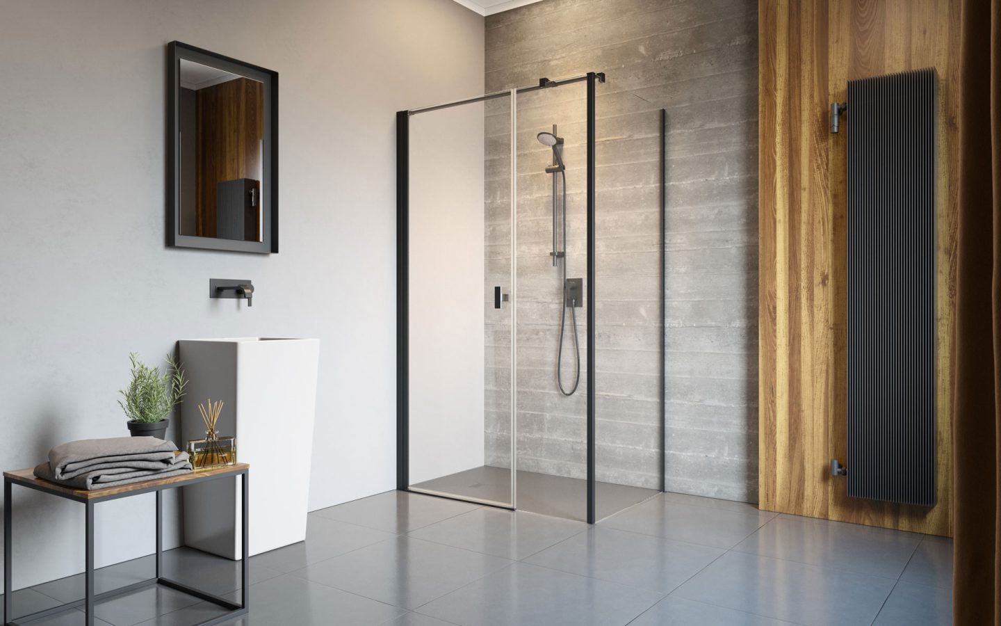 Nes Black — это кабины, двери и шторки на ванну — с фурнитурой в цвете «Black». Дополнительно несколько моделей Nes Black доступно со стеклом Frame/Factory на котором черные полоски изготовлены из устойчивой, керамичной краски.